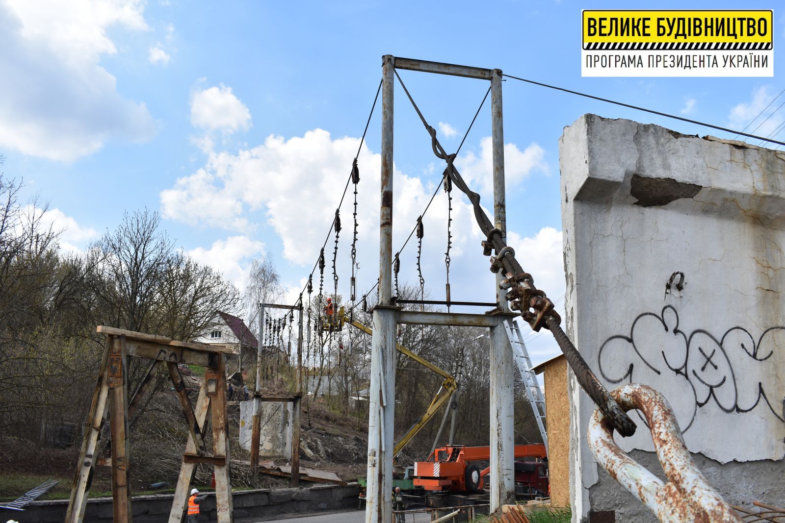Ремонт искусственного сооружения начат в апреле. Проектом реконструкции предусмотрен монтаж новых опор, пилона с вантами, нового пролетного строения, лестницы и установка современного освещения. Сейчас продолжаются демонтажные работы.