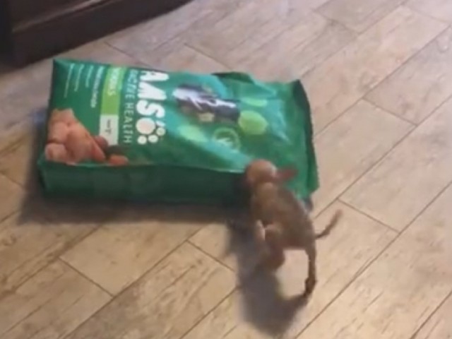 Маленькому чихуахуа по кличке Райдер всего два месяца, так что он в первый раз в жизни увидел такой большой мешок с кормом.