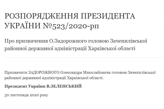 «Назначить ЗАДОРОЖНОГО Александра Николаевича председателем Зачепиловской районной государственной администрации Харьковской области», - говорится в документе .