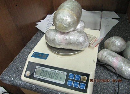 Внутри, под ноутбуком, таможенники обнаружили 6 штук полиэтиленовых свертков с веществом серо-зеленого цвета растительного происхождения. Похже Арчи сработал третий раз - на этот раз на карман брюк пассажира, в котором обнаружен был еще один тайник с пакетом такого же вещества. Общий вес найденных свертков - 400 гр.