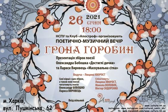 Посетителей ждет презентация сборников поэзии Александра Бобошко «Достиглі дички» и Ларисы Выровец «Маскувальна сітка». Произведения будут исполнять: Люцина Хворост, Николай Воловик, Виктор Сидоренко.