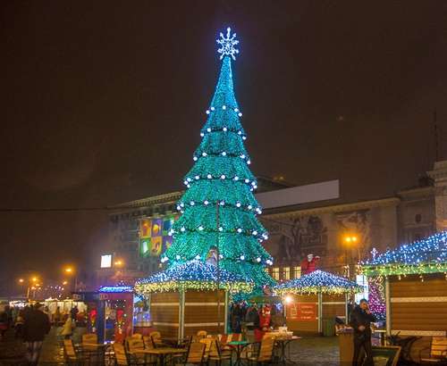 Субботним вечером зажглись огни на главной харьковской елке. Вместе с этим «официозом» открылся и новогодний городок на площади Свободы. При ближайшем рассмотрении елка оказалась такой же, как и в прошлом году. Для новогоднего городка в этом году не делали новых декораций: было отремонтировано и установлено то, что использовалось в предыдущие годы. Разве что переписали программу иллюминации, и теперь неутомимый Дед Мороз, словно пушкинский «кот ученый все ходит по цепи кругом», таская за собой нечто зеленое. Над Дедом Морозом в противоположном направлении отсвечивается количество дней, оставшихся до Нового года.