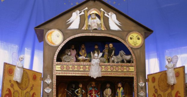 Справка. Вертеп - украинский народный кукольный театр. Представления вертепа по традиции устраивались на Рождество. В верхнем ярусе двухярусного ящика разыгрывались эпизоды из Евангелия (рождественская драма), в нижнем - интермедии. Действие сопровождалось музыкой, в том числе рождественскими песнопениями.