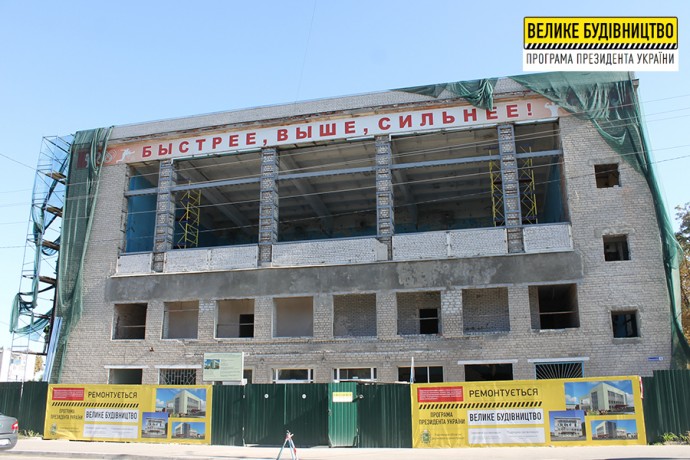 Реконструкция спорткомплекса проходит в рамках Программы Президента Украины Владимира Зеленского «Большое строительство». Сейчас выполняются работы по остеклению фасада, по монтажу подсистем и основному фасаду.