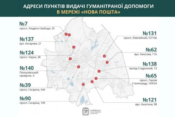 Адреса пунктов выдачи гуманитарной помощи в сети «Новая Почта» в инфографике.