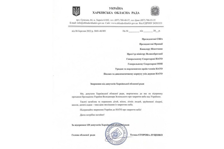 Харьковский областной совет обратился с призывом к главам государств и правительств, парламентам и народам государств-членов НАТО поддержать просьбу Президента Украины Владимира Зеленского о закрытии неба над Украиной.