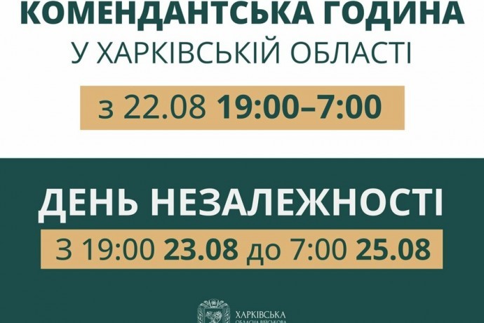 Как сообщил начальник ХОВА Олег Синегубов, с 22 августа 2022 года комендантский час продлится с 19.00 часов до 7.00 часов на следующий день.
