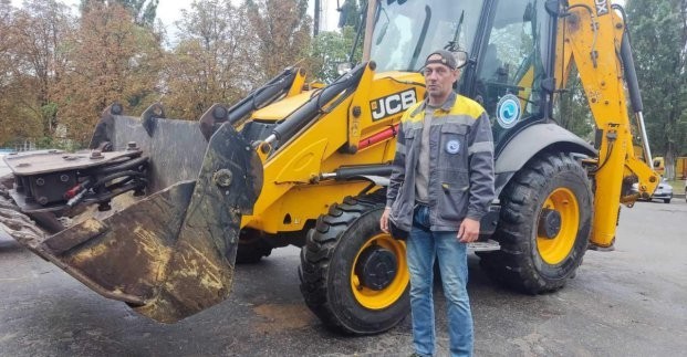 Машинист экскаватора 5-го разряда Комплекса спецмашин и механизмов КП «Харьковводоканал» Павел Петручек работает над восстановлением водоснабжения в Харькове.