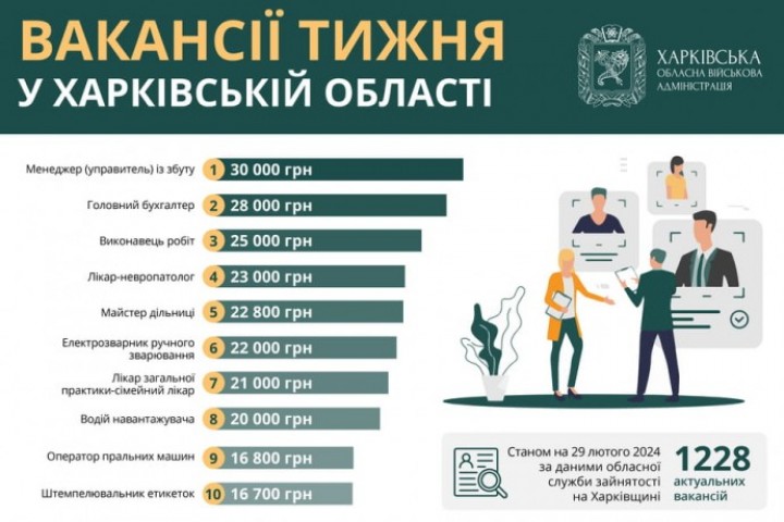 Станом на 29 лютого 2024 року, за даними обласної служби зайнятості, на Харківщині актуальні 1228 вакансій.