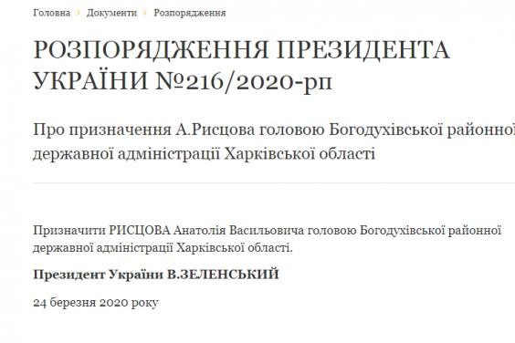 „Назначить РЫСЦОВА Анатолия Васильевича председателем Богодуховской районной государственной администрации Харьковской области”, - говорится в документе .
