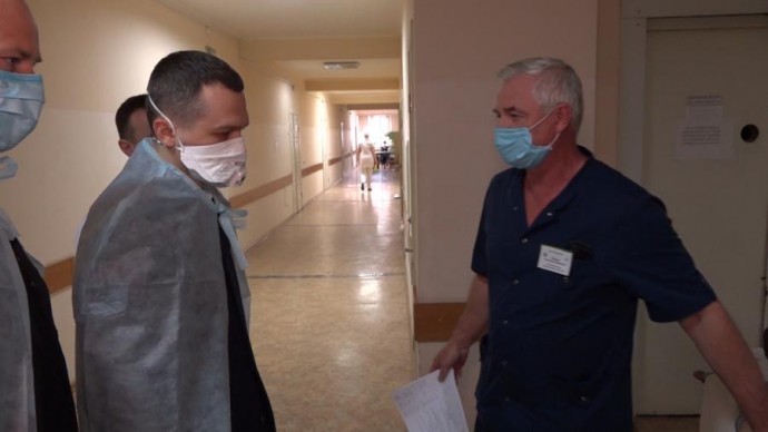 Перед входом в госпиталь Алексей Кучер и все лица, которые его сопровождали, прошли температурный скрининг. Эта процедура сейчас является обязательной как для посетителей, так и для медперсонала.