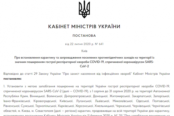 С 1 августа вступает в силу Постановление Кабинета министров от 22 июля 2020 №641 «Об установлении карантина и внедрении усиленных противоэпидемических мероприятий на территории со значительным распространением острой респираторной болезни COVID-19, вызванной коронавирусом SARS-CoV-2».