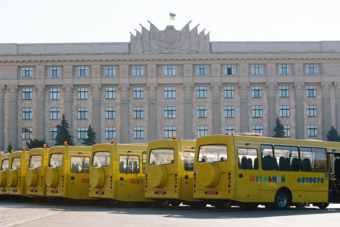 Ключи от новых автобусов передали руководителям отделов образования РГА и объединенных громад региона 14 сентября на площади Свободы в Харькове.