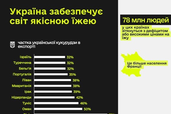 «Но сегодня, 7 июня 2022 года, мы вынуждены говорить, прежде всего, об угрозе острого дефицита пищевых продуктов и голода в целом ряде стран мира. Все - из-за полномасштабной войны, развязанной россией против Украины. Из-за блокирования наших морских портов, потери посевных площадей Украина не может в полной мере выполнить свою продовольственную миссию и обеспечить сотни миллионов людей качественной едой. А в мире нет альтернативы нашему продовольствию. Ведь Украина - мировой лидер: она 1-я в мире по экспорту подсолнечного масла, 2-я - по продаже зерна, 3-я - ячменя, 4-я - по реализации кукурузы, 9-я - по поставкам мяса», - сообщили в Министерстве аграрной политики и продовольствия Украины.