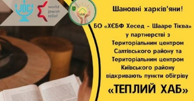 БО «Харьковский еврейский благотворительный фонд Хесед - Шааре Тиква» в партнерстве с территориальными центрами Киевского и Салтовского районов открывает пункты обогрева «Теплый хаб».