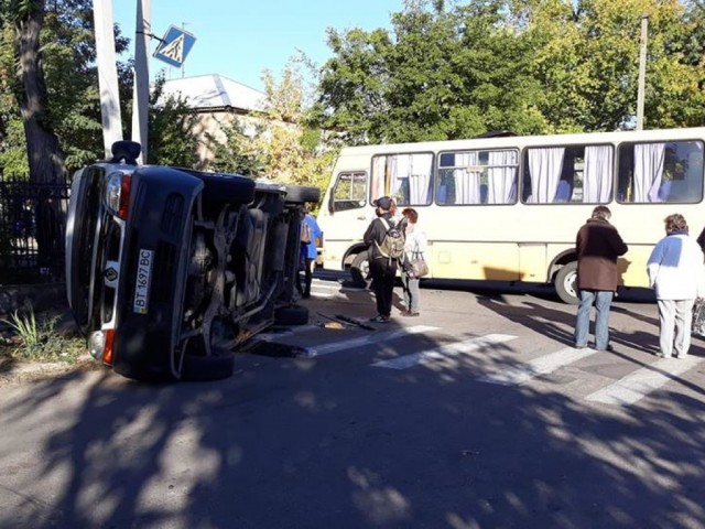 Утром 6 октября в г. Новой Каховке Херсонской области произошло дорожно-транспортное происшествие, в результате которого на углу улиц Пушкина и Героев Украины на борт перевернулся микроавтобус.