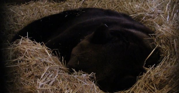«Набрав вес, медведи становятся малоподвижными, количество корма сокращается, и животные готовятся ко сну. Начинается подготовка берлог. Для утепления медведи используют солому, она дольше служит по сравнению с сеном. На одну берлогу уходит от 5 до 8 тюков соломы. Ее медведи укладывают в виде гнезда. Если зима теплая, то углубление - до самого пола, если холодная - полностью накрываются соломой. Жарко - спят на спине, холодно - сворачиваются клубком, мордочку под себя», - сообщили в зоопарке.